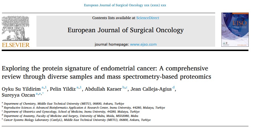Our graduate student Öykü Su Yıldırım and Pelin Yıldız’s paper, titled “Exploring the protein signature of endometrial cancer: A comprehensive review through diverse samples and mass spectrometry-based proteomics” where they are the first authors, has been published. The paper, co-authored by Abdullah Karaer, Jean Calleja-Agius, and our PI Sureyya Ozcan, became available online on 24 October, 2024, in the European Journal of Surgical Oncology.
